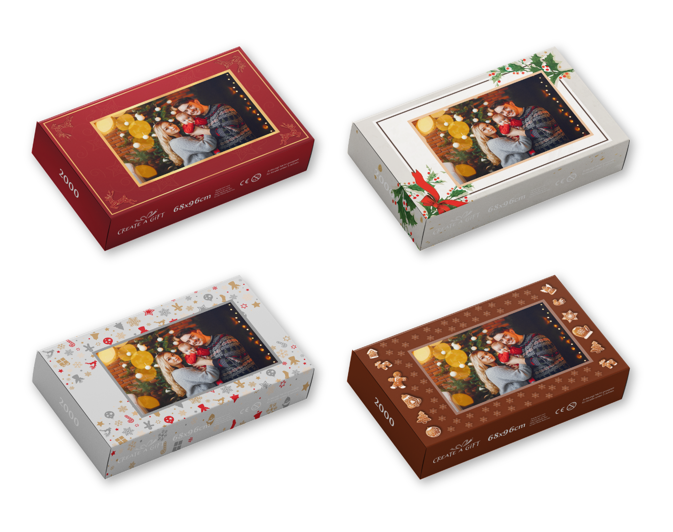 Nesložené puzzle, vložené do sáčku a zabalené v krabici s vybraným vzorem.